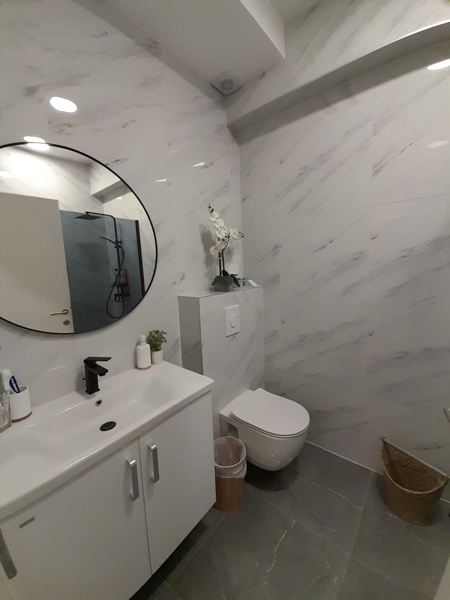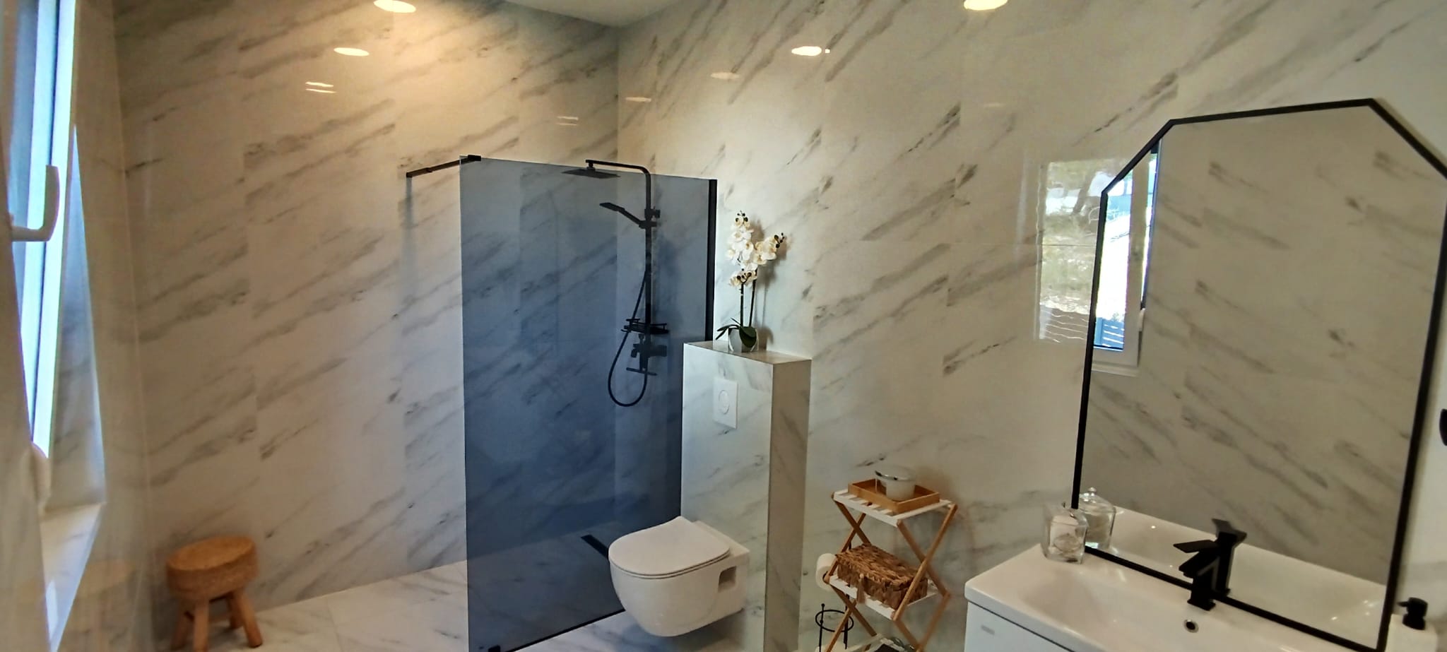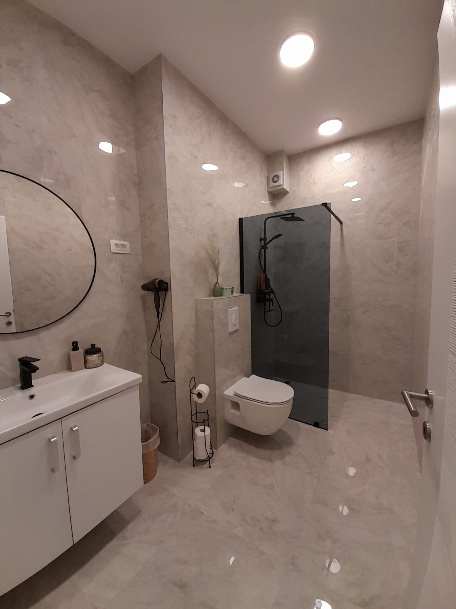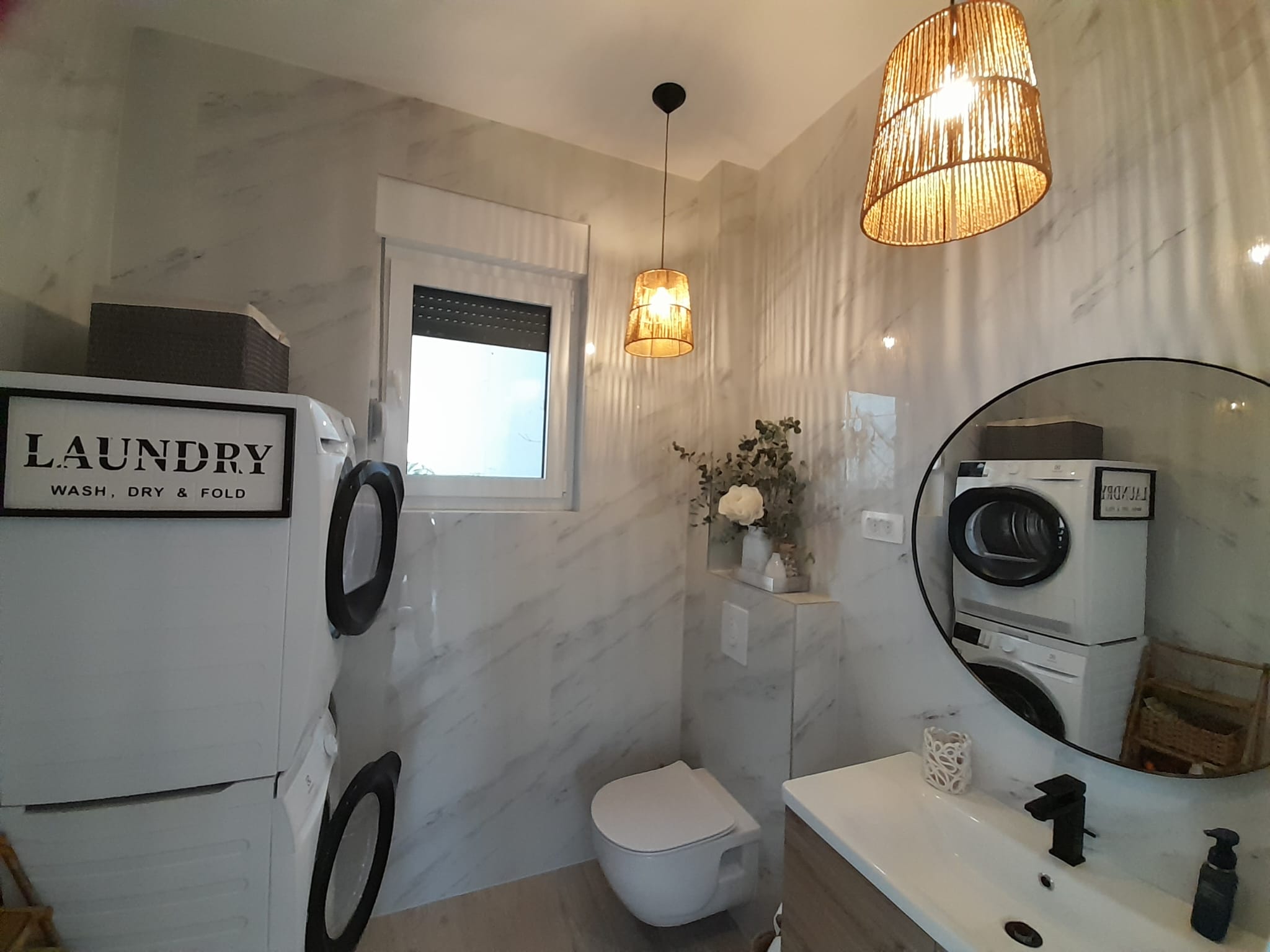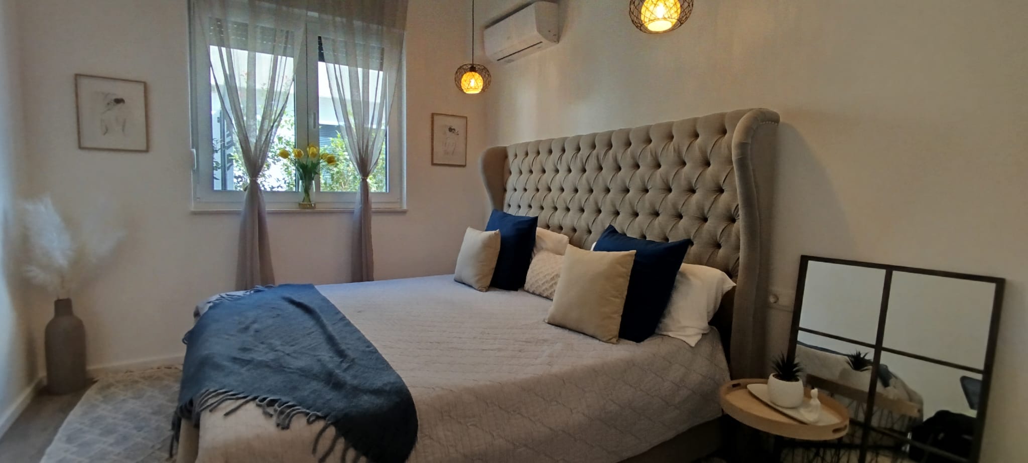 Spread across multiple levels, Villa Serenity features three elegant bedrooms, each with its own full private bathroom, ensuring comfort and privacy for every guest. At the top level, enjoy our stunning rooftop terrace suite, which includes a pull-out sofa, full bathroom, TV, and a dedicated workspace desk—perfect for extra sleeping space, remote work, or peaceful